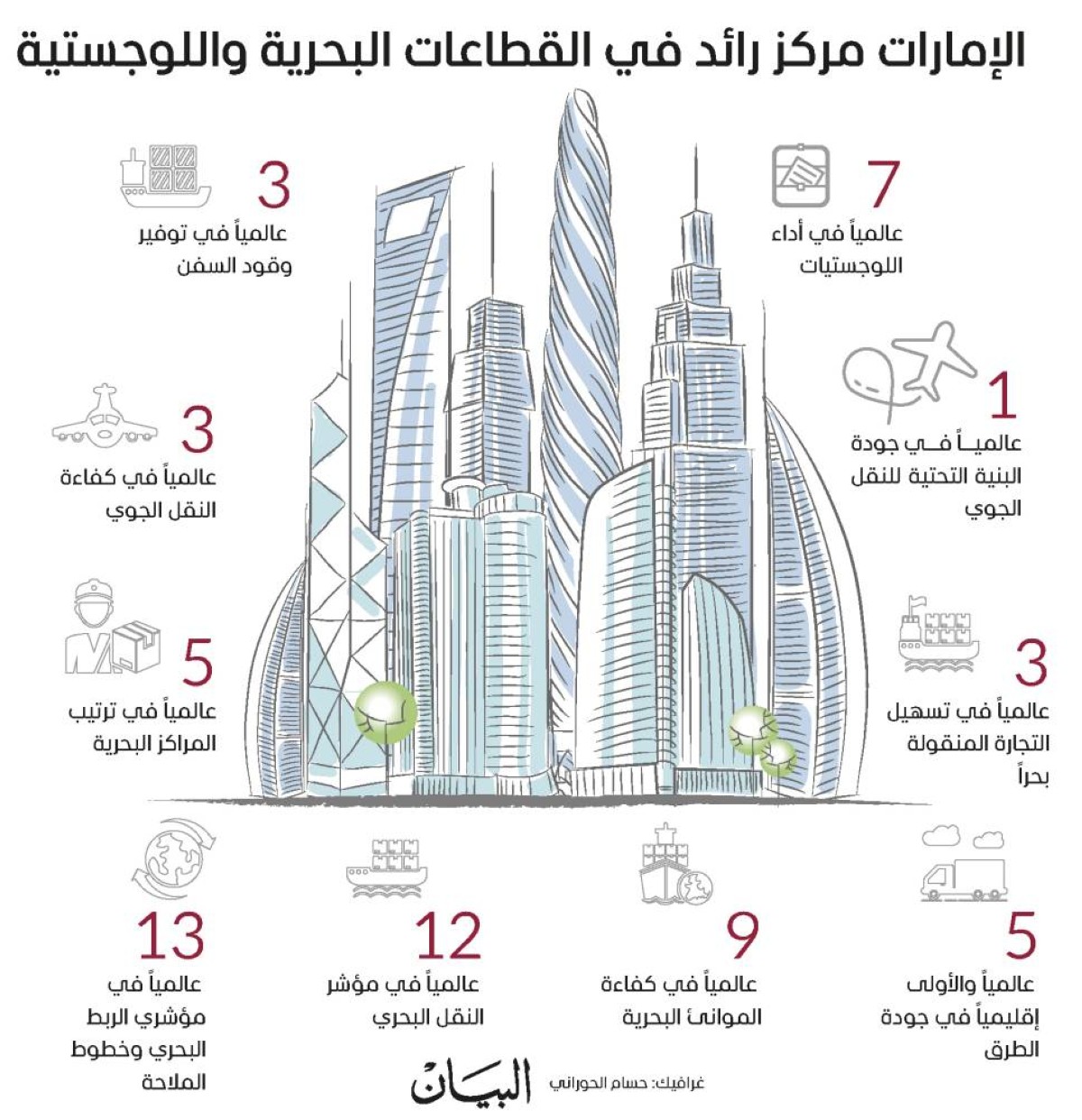 وعلى صعيد الإمارات، فقد احتلت المرتبة السابعة عالمياً في أداء اللوجستيات 2023، والمرتبة الأولى عالمياً في جودة البنية التحتية للنقل الجوي، والثالثة في كل من تسهيل التجارة المنقولة بحراً، وتوفير وقود السفن، وكفاءة النقل الجوي.