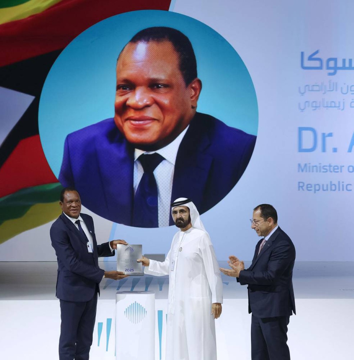 كرّم صاحب السمو الشيخ محمد بن راشد آل مكتوم نائب رئيس الدولة رئيس مجلس الوزراء حاكم دبي "رعاه الله"، معالي الدكتور أنكسيوس ماسوكا، وزير الزراعة وشؤون الأراضي في جمهورية زيمبابوي، بجائزة أفضل وزير في العالم في دورتها الثامنة ضمن أعمال القمة العالمية للحكومات 2025.