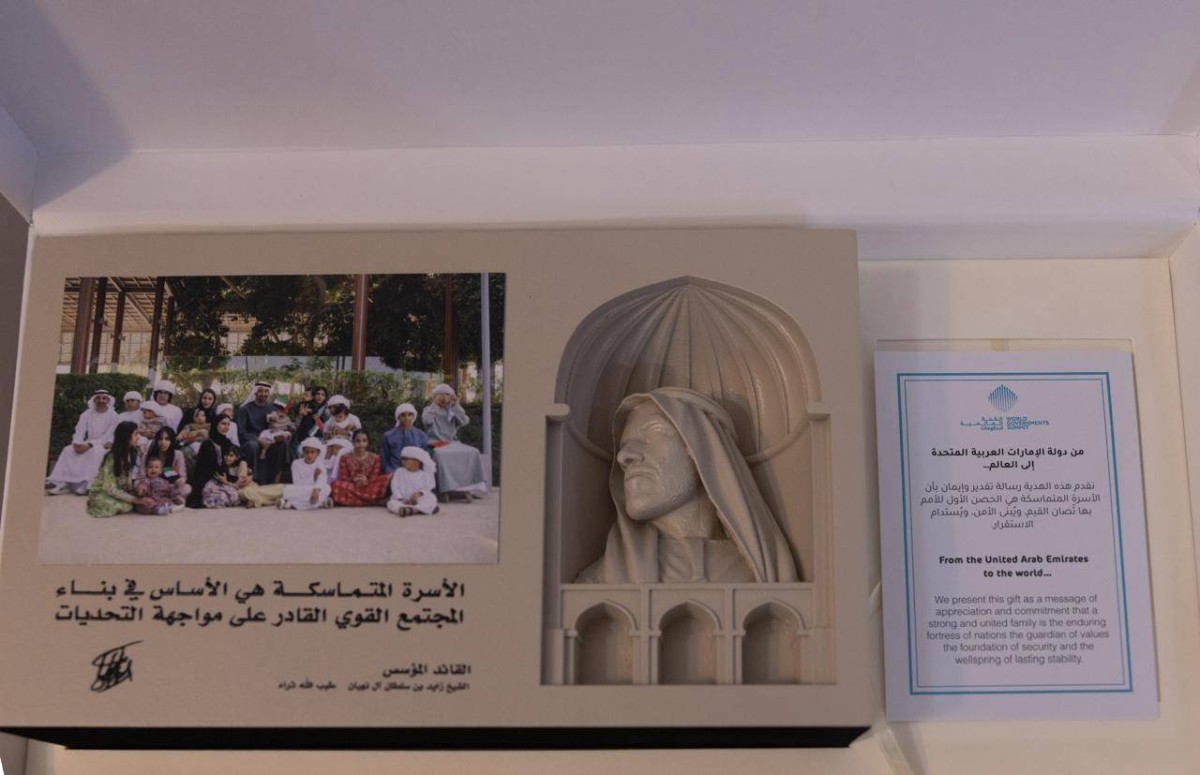 وتضمنت الهدية صورة لصاحب السمو الشيخ محمد بن زايد آل نهيان، رئيس الدولة ،حفظه الله، برفقة أبنائه وأحفاده، وإلى جانبها نقش مجسم لصورة للمغفور له بإذن الله الشيخ زايد بن سلطان آل نهيان، طيب الله ثراه، مدوناً بجواره قوله الخالد: «الأسرة المتماسكة هي الأساس في بناء المجتمع القوي القادر على مواجهة التحديات»، في تأكيد واضح على أن تماسك الأسرة هو الركيزة الأولى لاستقرار المجتمع وأمنه. كما حملت الهدية رسالة موجهة من دولة الإمارات العربية المتحدة إلى العالم جاء فيها: «من دولة الإمارات العربية المتحدة إلى العالم… نقدم هذه الهدية رسالة تقدير وإيمان بأن الأسرة المتماسكة هي الحصن الأول للأمم، بها تصان القيم، ويبنى. الأمن، ويستدام الاستقرار». وعكست الهدية رؤية الإمارات التي تضع الأسرة في قلب مشروعها التنموي، باعتبارها الأساس المتين لبناء الأوطان وصناعة السلام.