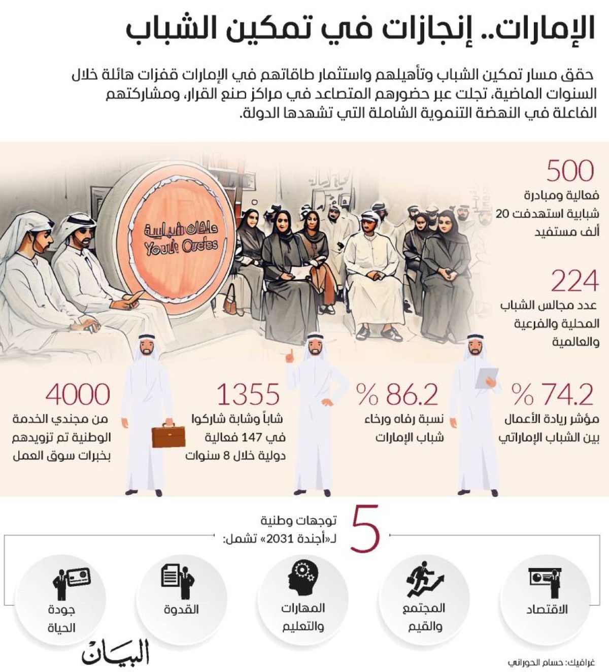 نحن في دولة الإمارات محظوظون بقيادة استثنائية تؤمن بقدرات الشباب وتضع تمكينهم في قلب استراتيجيات التنمية، وخلال السنوات التسع الماضية، أثبتت التجربة الإماراتية في تمكين الشباب نجاحها على أكثر من صعيد، رأينا خلالها نتائج ملموسة على الصُّعد والمجالات كافة.