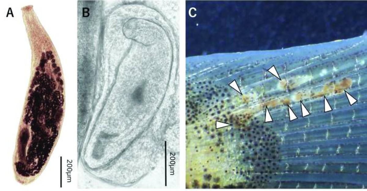 ولاحظ الباحثون طفيليات صفراء اللون في زعانف وقواعد زعانف الأسماك المصابة؛ وقد وجدوا مستويات عالية بشكل خاص من الطفيليات في الأنواع الغازية مثل سمك السلور القنواتي وسمك البلو جيل.