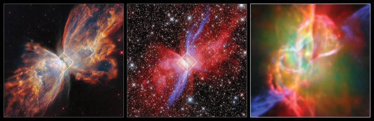 وذكر التقرير أن سديم الفراشة يقع على بعد 3400 سنة ضوئية من الأرض، ويقدم مثالاً حياً على هذه العملية الكونية المذهلة. ومنذ سبعينيات القرن الماضي، أثار شكل الفراشة للسديم فضول العلماء، لكن الغبار الكوني الكثيف حجب النجم المركزي عن الأنظار. وجاء الحل مع تلسكوب جيمس ويب وأدواته المتطورة.