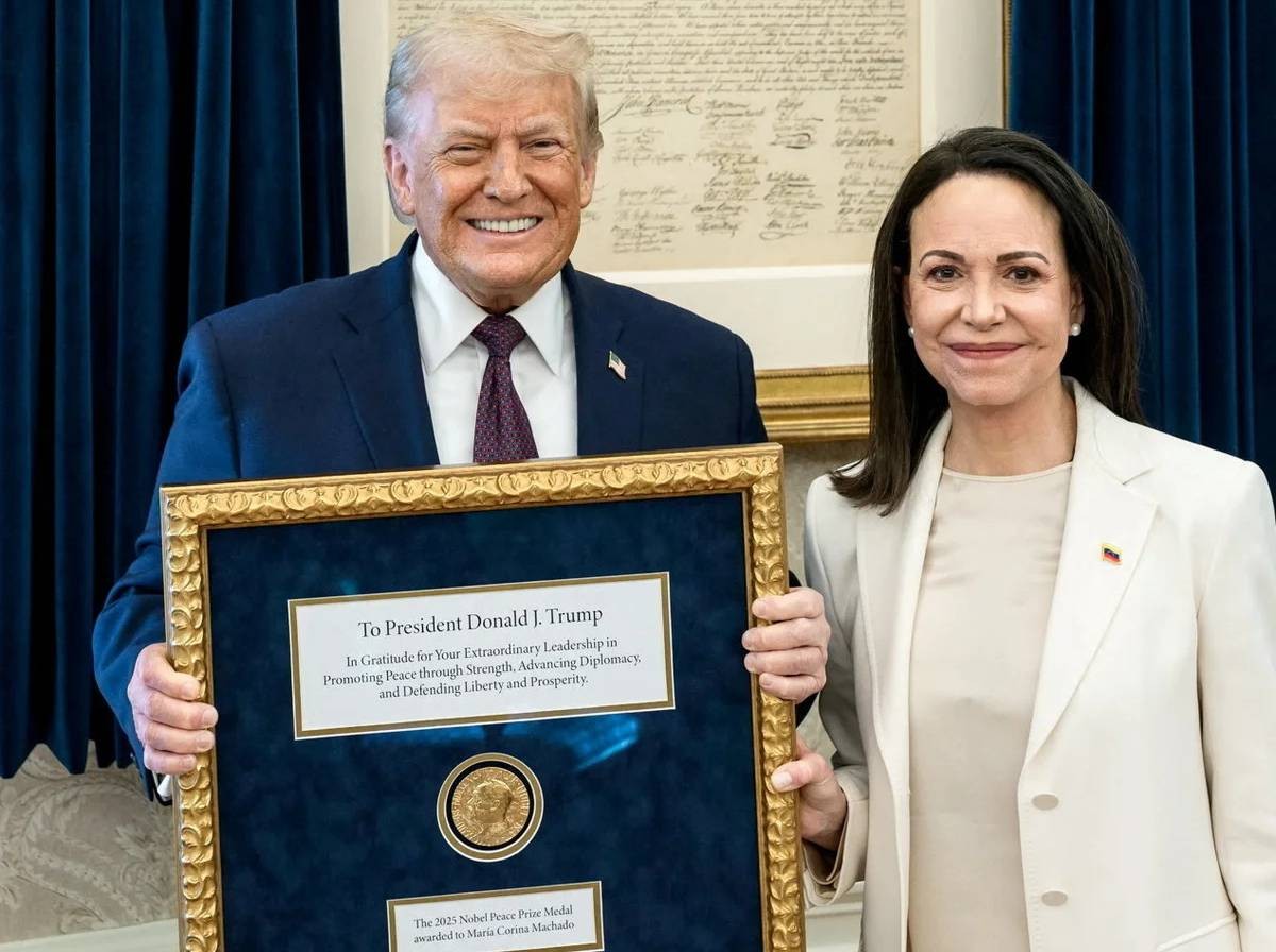أهدت زعيمة المعارضة الفنزويلية ماريا كورينا ماتشادو، أمس الخميس، الرئيس الأمريكي دونالد ترامب ميدالية جائزة نوبل للسلام خلال اجتماع في البيت الأبيض، في خطوة اعتبرها مراقبون محاولة للتأثير على توجهات الإدارة الأمريكية تجاه مستقبل فنزويلا السياسي.