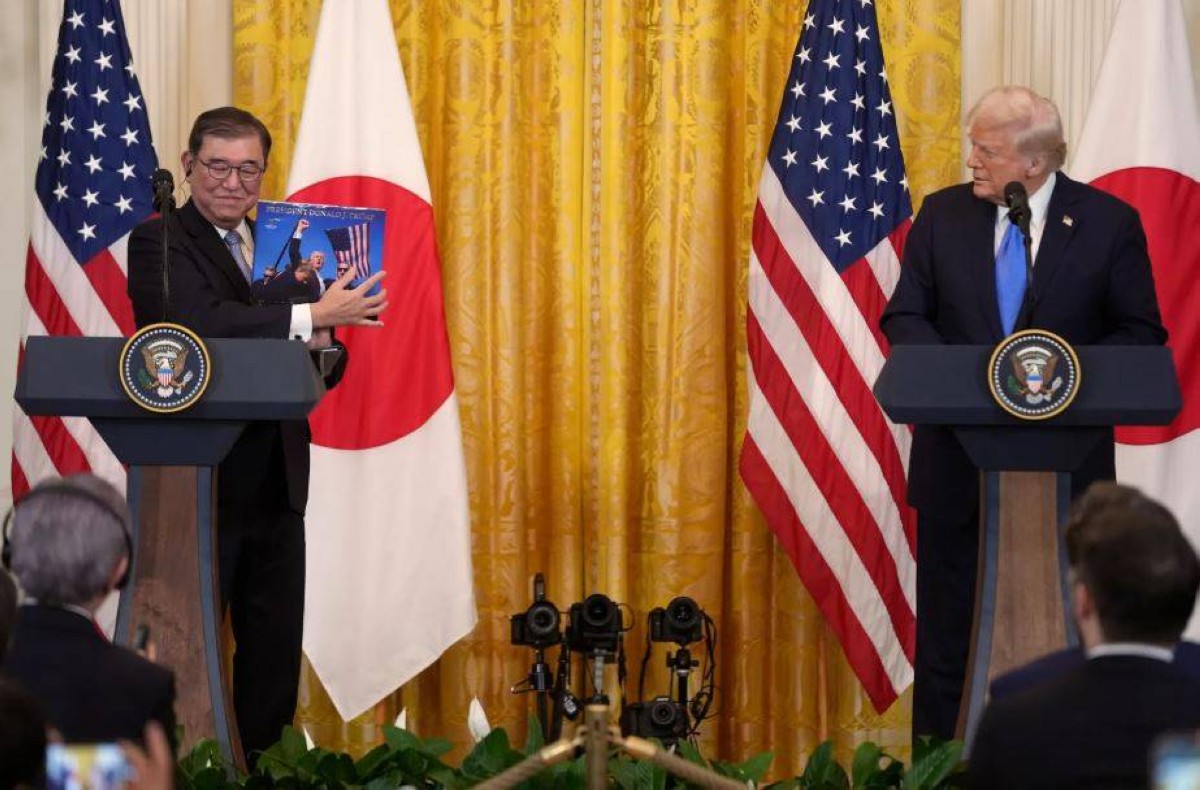 في المقابل، أهدى الرئيس الأمريكي دونالد ترامب رئيس الوزراء الياباني شيغيرو إيشيبا نسخة من كتابه المصوّر "أنقذوا أميركا" الذي يحتوي على صورة الغلاف من محاولة اغتياله الأولى في بتلر، بنسلفانيا، الصيف الماضي.