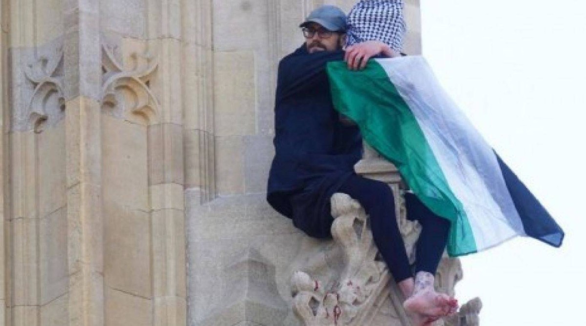 توقفت حركة المرور حول قصر وستمنستر في العاصمة البريطانية، لندن، معظم يوم السبت، حيث حاولت فرق الطوارئ الوصول إلى رجل تسلق برج بيج بن وهو يحمل العلم الفلسطيني.