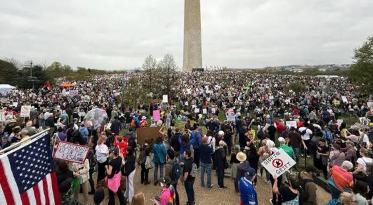 وتدفق الآلاف نحو نصب واشنطن التذكاري مع انطلاق الاحتجاجات وسط أجواء غائمة وأمطار خفيفة.