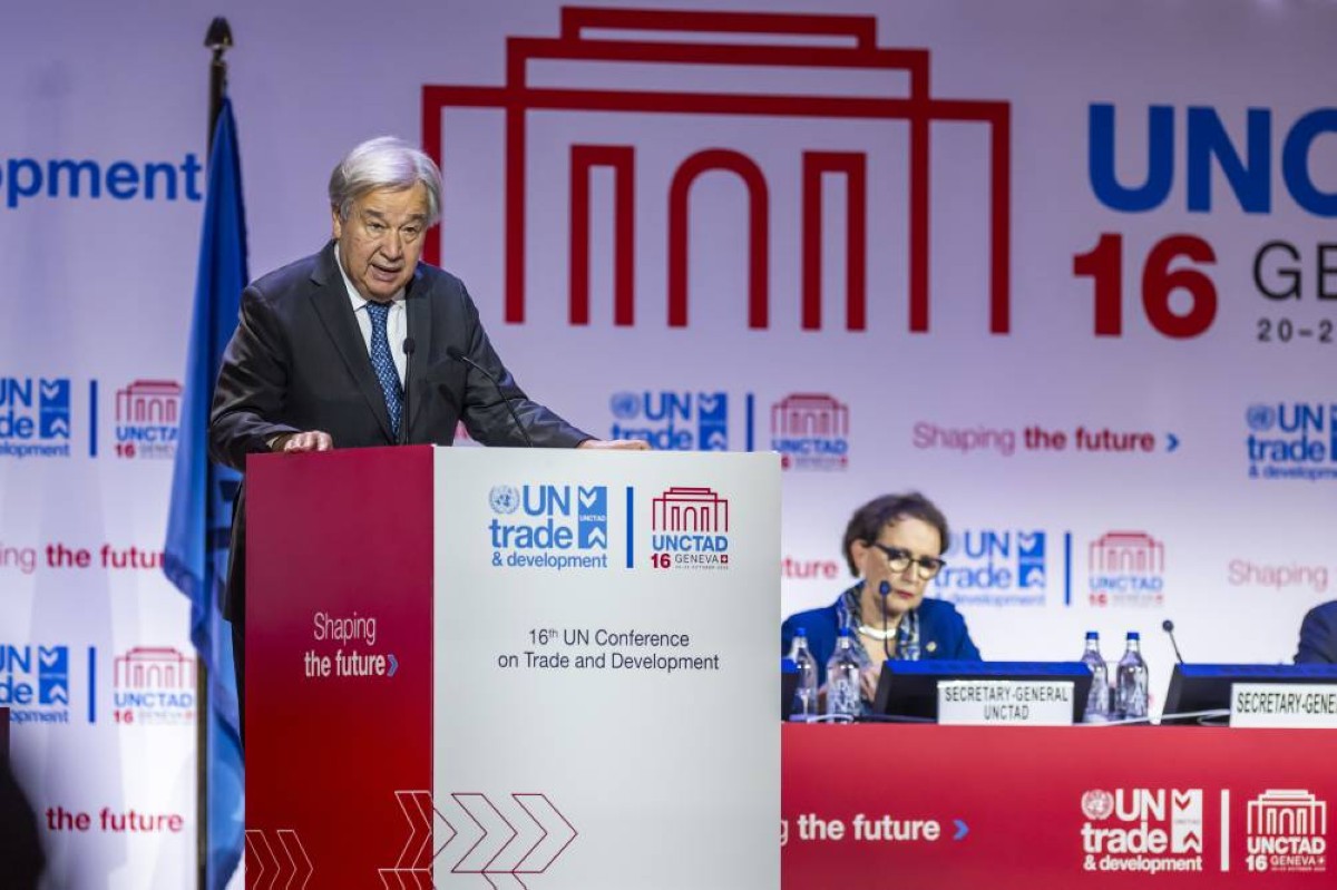وقال غوتيريش في كلمته أمام وفود مؤتمر الأمم المتحدة للتجارة والتنمية في جنيف: "نظام التجارة القائم على القواعد مهدد بالانهيار"، في ظل تصاعد الحروب التجارية وتزايد الحواجز أمام التجارة.