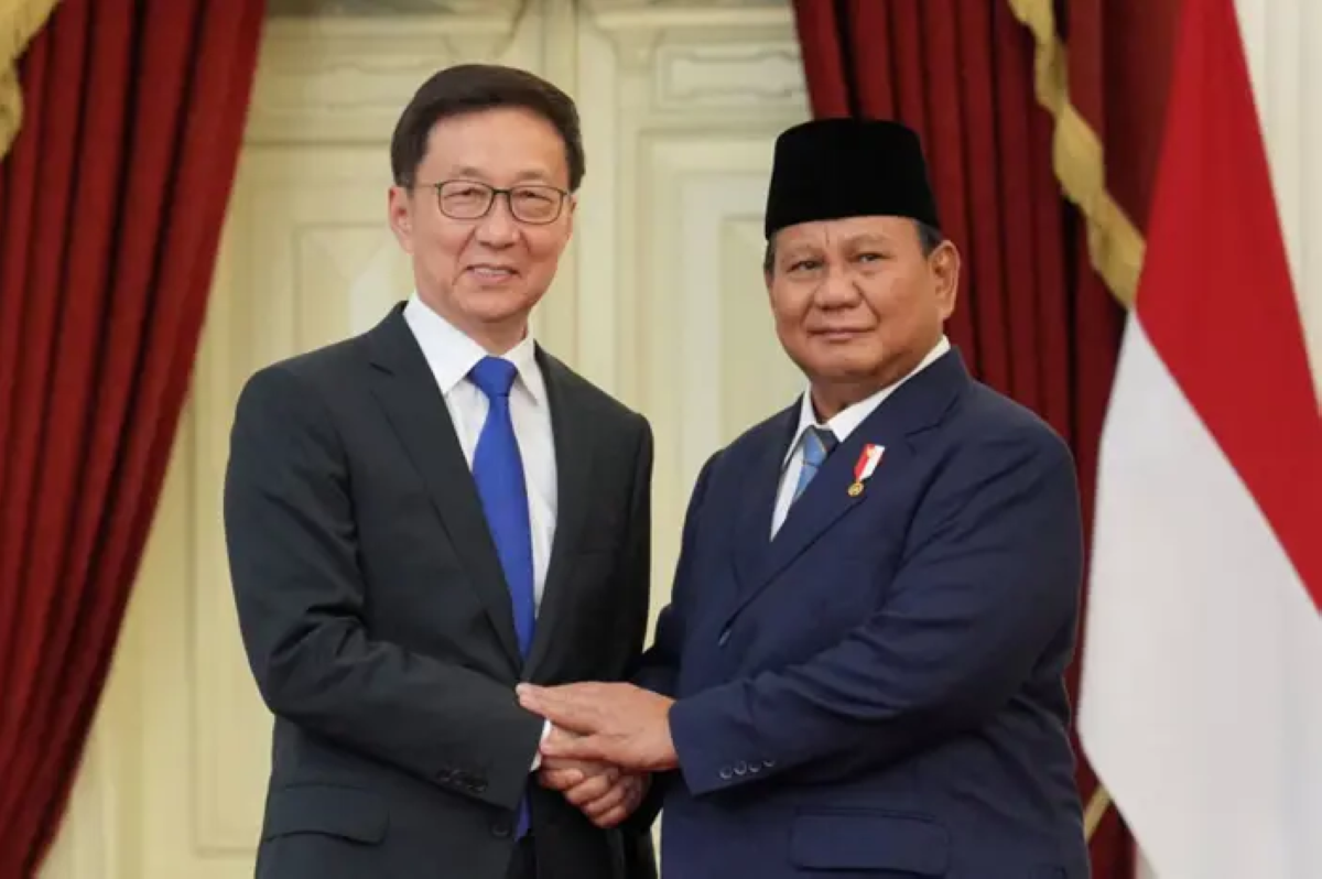 الرئيس برابو سوبيانتو يحيي نائب الرئيس الصيني هان تشنغ خلال اجتماعهما بعد تنصيب برابو في جاكرتا في 20 أكتوبر 2024.