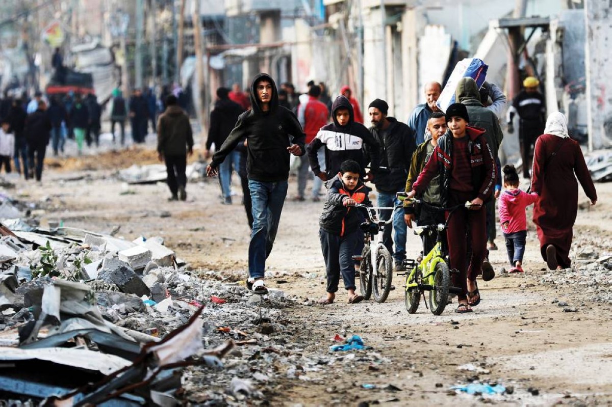 فلسطينيون في شارع مدمر بعد انسحاب القوات الإسرائيلية من مخيم النصيرات