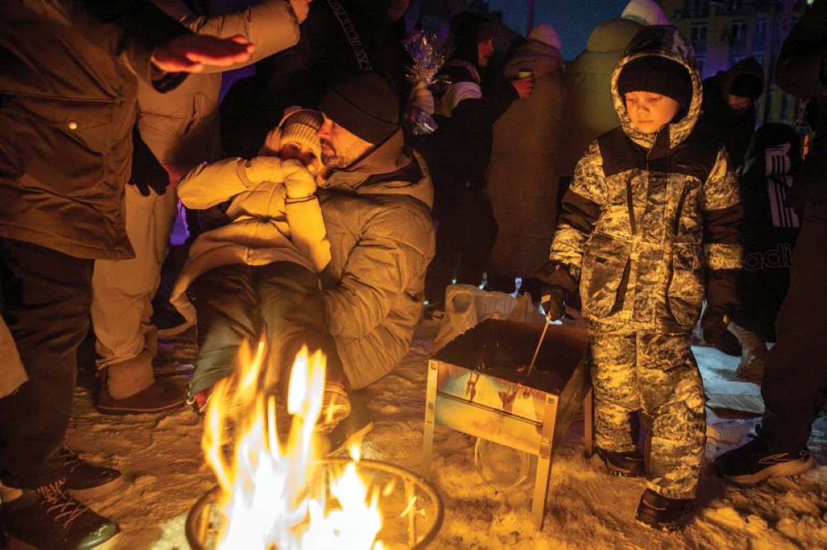 أوكرانيون في كييف يتدفأون بالنار في ظل انقطاع الكهرباء بعد غارات روسية