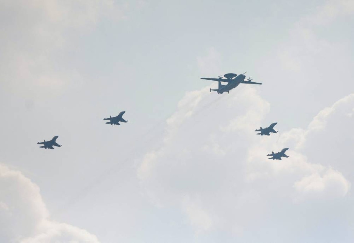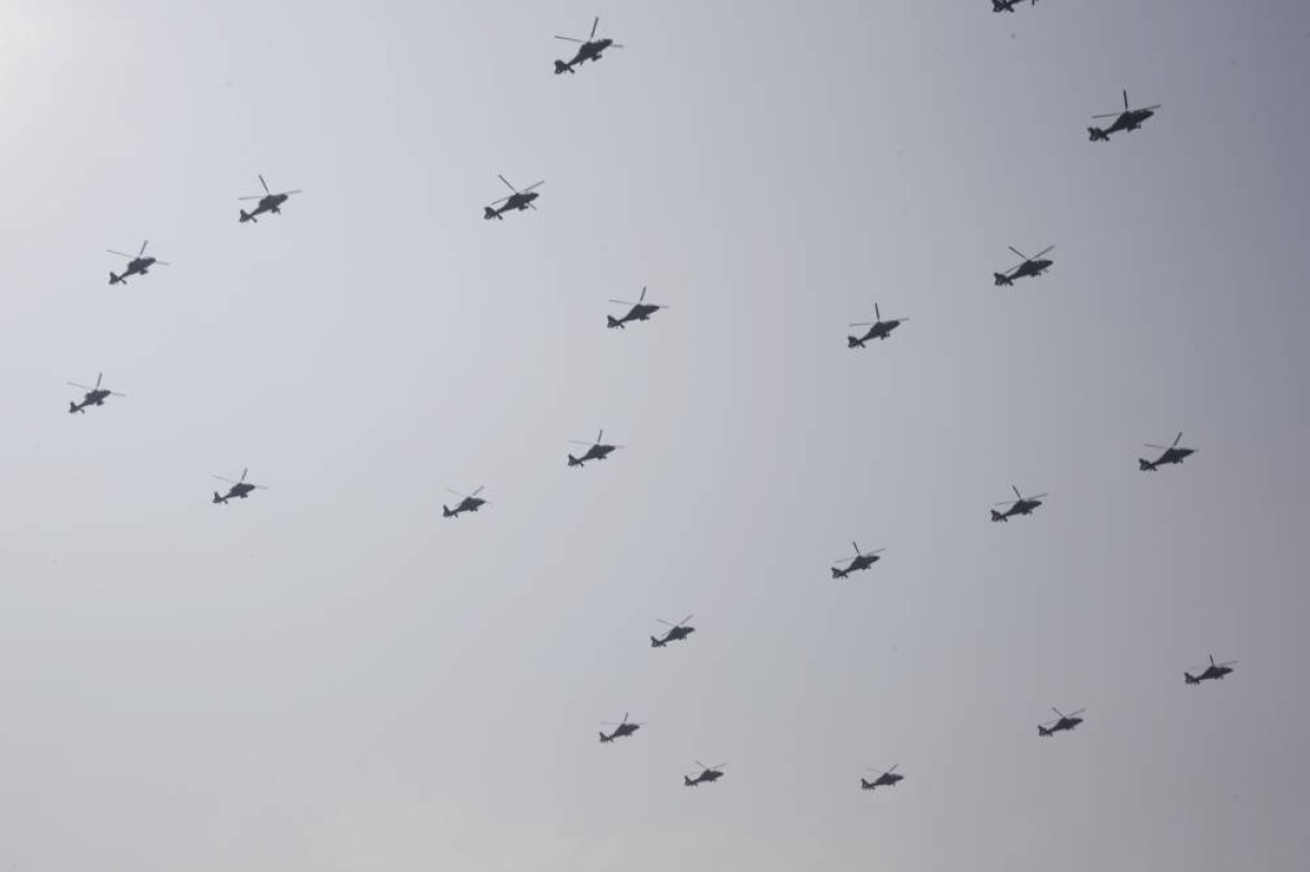 وحلقت طائرات هليكوبتر تحمل رايات كبيرة وطائرات مقاتلة في تشكيلات خلال العرض الذي استمر 70 دقيقة مليئة بالرمزية والدعاية التي بلغت ذروتها بإطلاق 80 ألف حمامة سلام وبالونات ملونة.