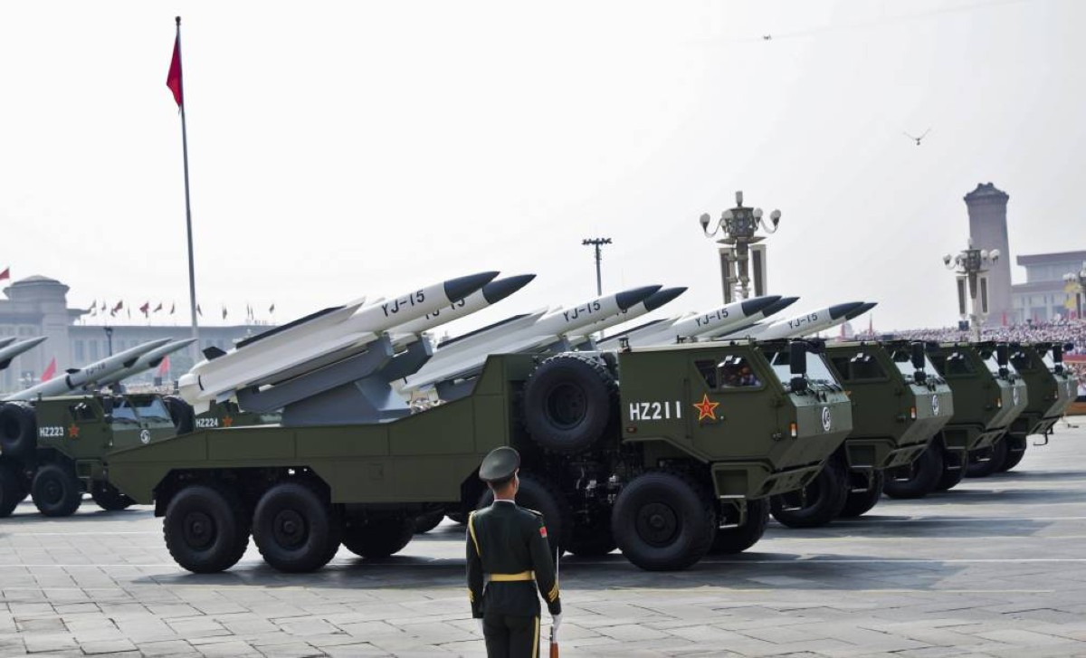 وتفقد شي وهو يستقل سيارة مكشوفة، القوات والمعدات العسكرية المتطورة ومنها صواريخ ودبابات وطائرات مسيرة.
