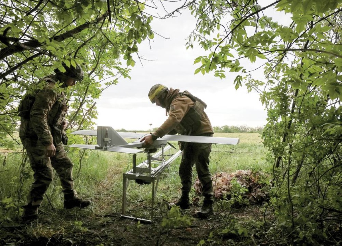 جنديان أوكرانيان يجهزان مسيّرة لإطلاقها على مواقع للقوات الروسية في خاركيف