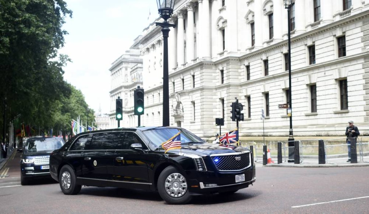 تم نقل نسختين متطابقتين من الليموزين الرئاسي، بالإضافة إلى العديد من سيارات الخدمة السرية الأخرى، إلى المملكة المتحدة على متن طائرات شحن عسكرية قبل وصول ترامب.