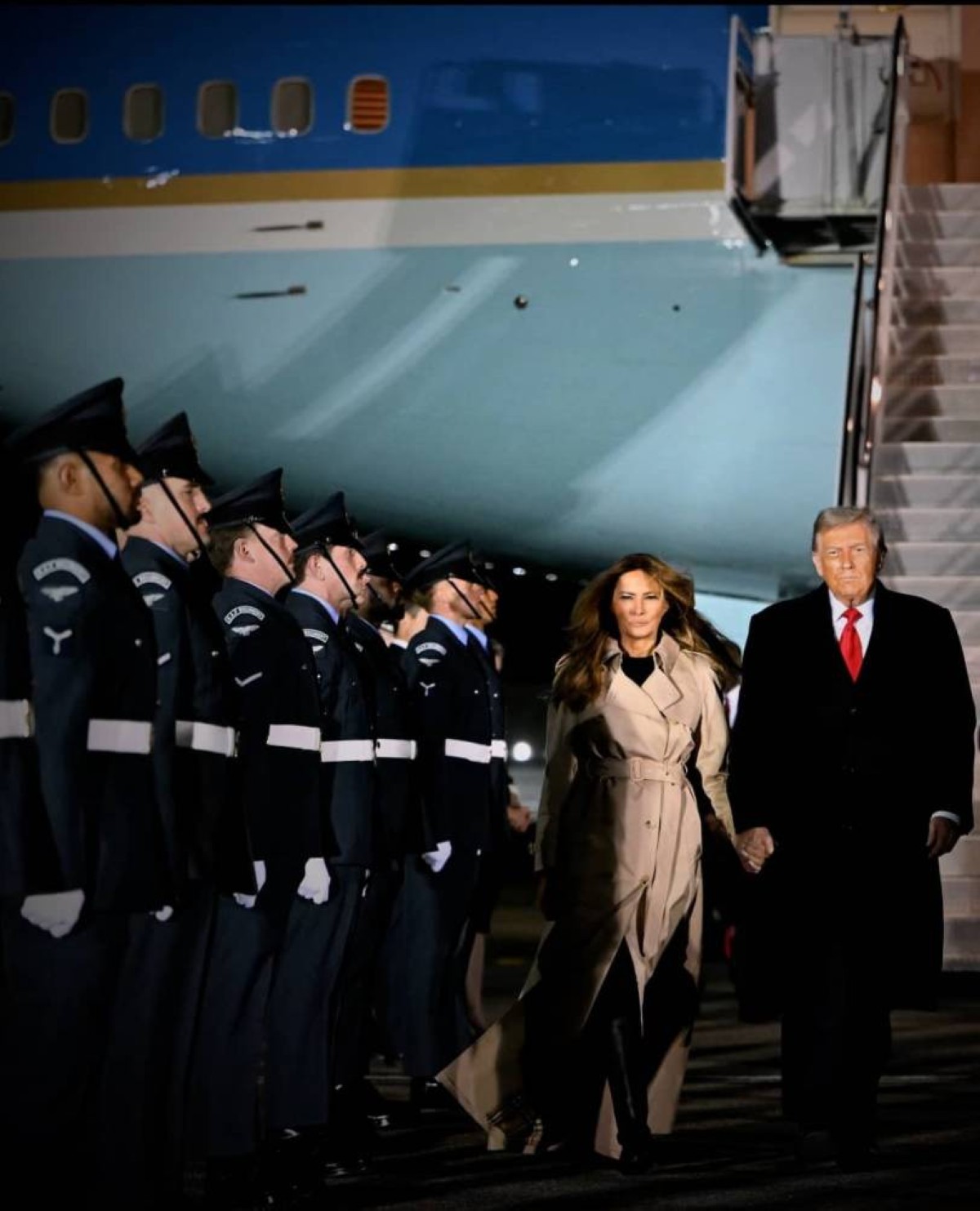 وصل ترامب، ومعه زوجته ميلانيا، إلى المملكة المتحدة على متن طائرته المخصصة من طراز بوينغ 747-200B، والمعروفة باسم "سلاح الجو واحد" (إير فورس وان).