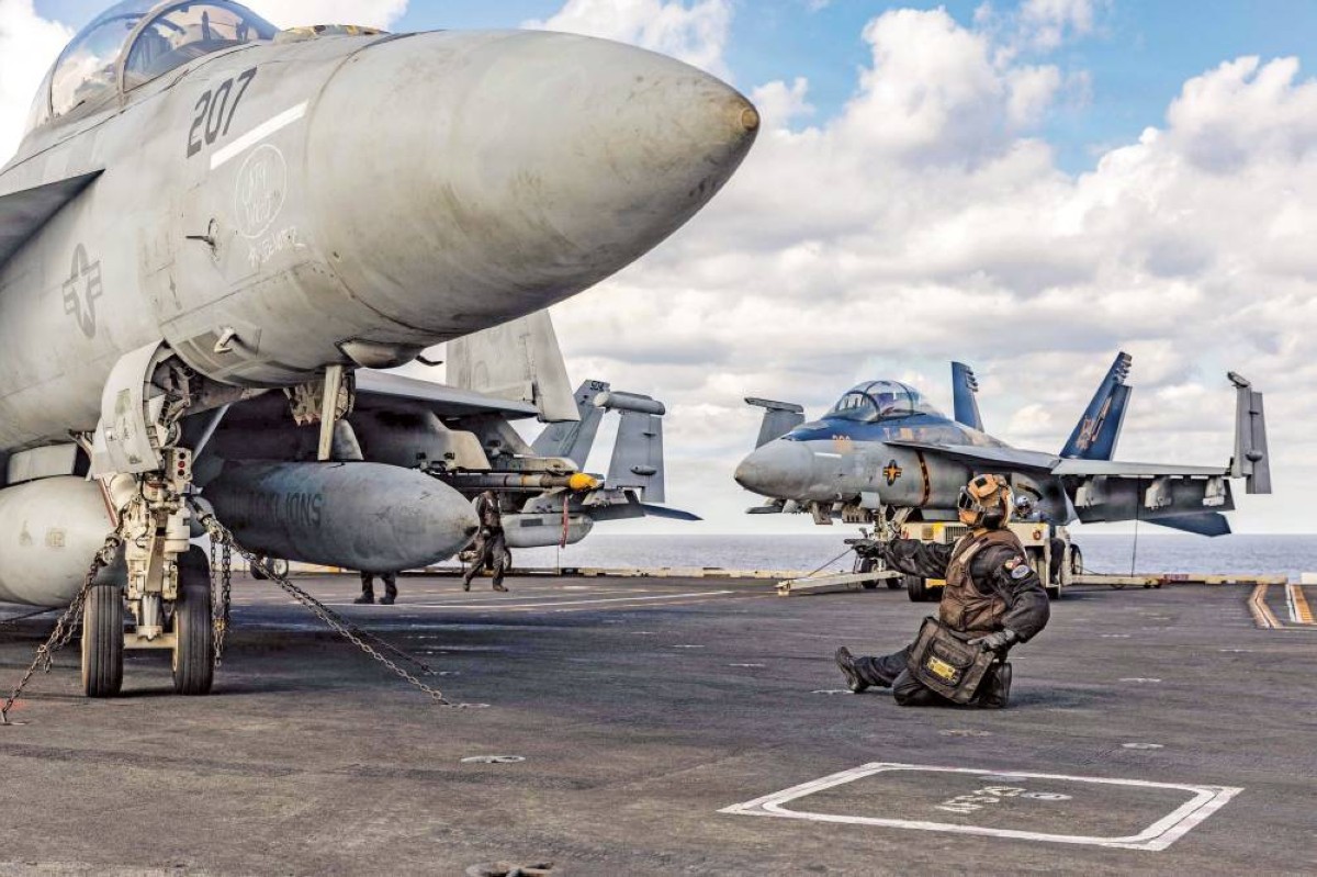 بحار أمريكي يُرسل إشارة على حاملة الطائرات «يو إس إس جيرالد آر. فورد» في شرق المتوسط