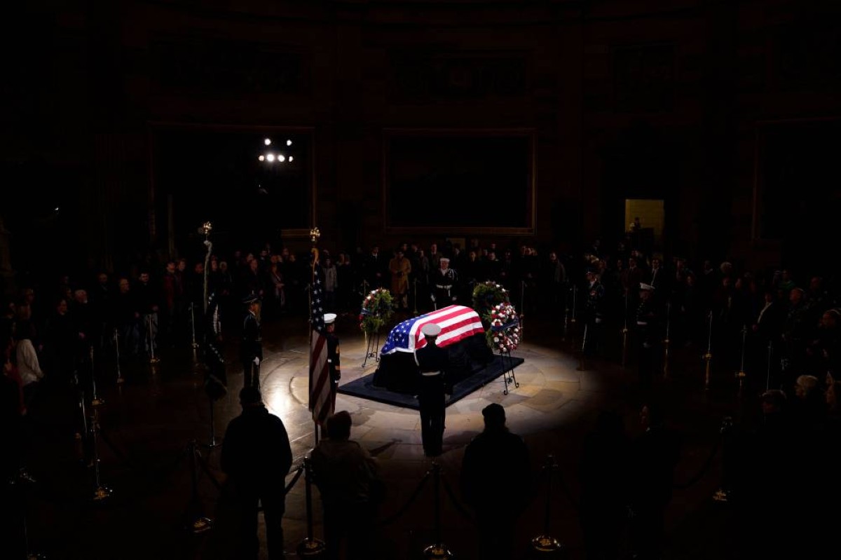 بعدها، حمل جنود النعش ملفوفا بالعلم الأميركي إلى القاعة المستديرة في مبنى الكابيتول حيث سيسجّى، محاطا بحرس الشرف، حتى الساعة السابعة من صباح الخميس.