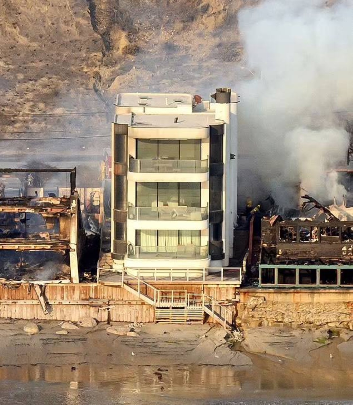 في مشهد نادر ومثير يبدو منزل مكون من ثلاثة طوابق سليمًا بشكل لا يصدق دون أن يحترق وسط بحر من الأنقاض المشتعلة في حرائق الغابات في لوس أنجلوس، حيث أتت النيران على كل شيء في طريقها، محولة أحياء بأكلمها إلى رماد، ولكن ظل منزل ديفيد ستاينر بلونه الأبيض اللامع بارزاً دون أن يحترق وسط الرماد والدمار الشديد .