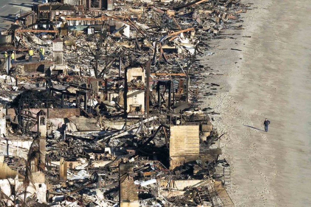 شخص يمشي على الشاطئ بجوار المنازل المتضررة من حريق باليساديس