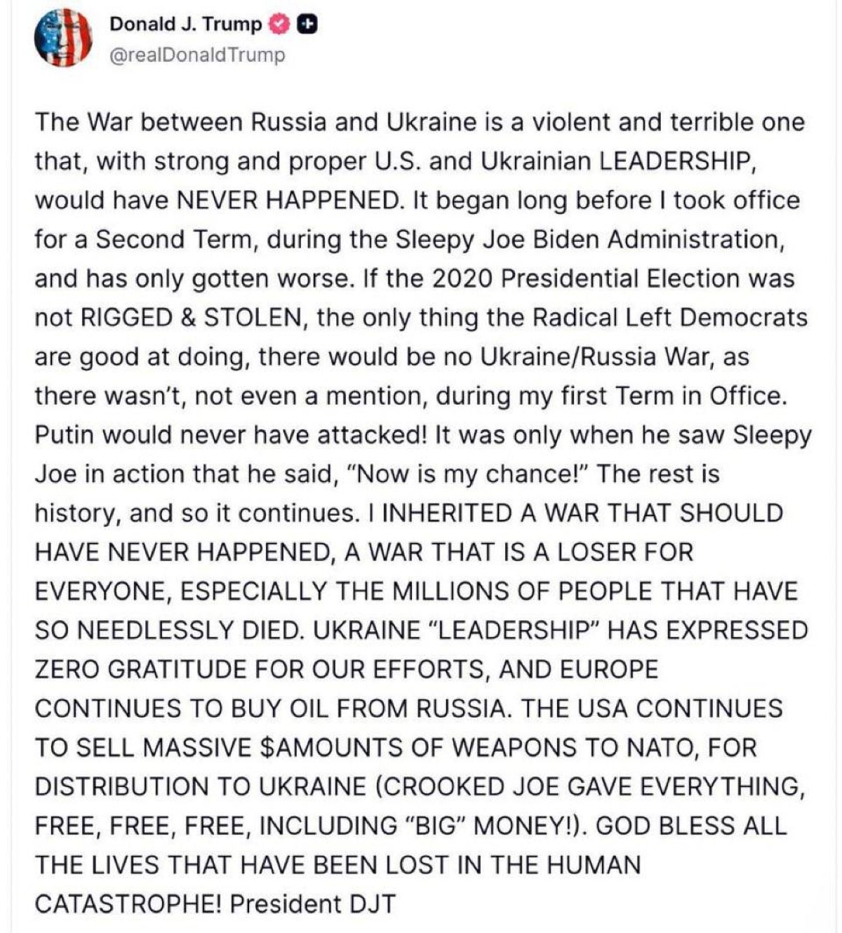 وبعد أقل من ثلاث ساعات من نشر ترامب لادعائه الكاذب صباح الأحد الماضي ، نشر زيلينسكي على منصة التواصل الاجتماعي X: "أوكرانيا ممتنة للولايات المتحدة، ولكل قلب أمريكي، وشخصيًا للرئيس ترامب على المساعدة التي ، بدءًا من صواريخ جافلين، أنقذت الأرواح الأوكرانية".