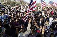 الجمعة 9 صفر 1424 هـ الموافق 11 ابريل 2003 خرج المنفيون العراقيون في الولايات المتحدة وايران وهولندا واستراليا الى الشوارع للاحتفال بسقوط نظام صدام حسين، وتحرش بعض المتظاهرين في ولاية ميتشيغان الاميركية، بفريق قناة الجزيرة الذي كان يغطي احتفالاتهم، تحت زعم انحيازها للنظام العراقي، فيما امل العراقيون بايران اقامة نظام اسلامي في بغداد. وخرج مئات الاميركيين من أصل عراقي إلى الشوارع في مدينة ديربورن بولاية ميتشيغان للاحتفال بسقوط نظام صدام حسين. وذكرت التقارير التليفزيونية أن الاميركيين من أصل عراقي لوحوا بالاعلام العراقية والاميركية ووقفوا على أسطح السيارات. واحتجوا على تواجد مراسل لمحطة الجزيرة الفضائية القطرية حيث اتهموا القناة بانها تأخذ جانب نظام حكومة الرئيس صدام حسين الذي اطيح به. وكانت ضاحية ديربورن في ديترويت التي تضم احد اضخم جاليات الشيعة العراقيين خارج الشرق الاوسط قد شهدت احتفالات غير عادية طيلة امس بنجاح القوات الاميركية في فرض سيطرتها على العاصمة العراقية حيث اخذ الناس يرقصون ويسيرون في قوافل من السيارات المزينة بالزهور والاعلام العراقية والاميركية. وتوترت الاجواء عندما شاهد حشد من 1500 محتفل بمتنزه ديربورن مراسلا ومصورا يعملان لحساب الجزيرة حيث اخذوا يوجهون اليهما الاهانات. واخذ الرجال يهتفون بغضب «تسقط تسقط الجزيرة» فيما تحركت الشرطة لحماية المراسل نظام مهداوي الذي قدم من واشنطن لتغطية ردود افعال الاميركيين من اصل عراقي على سقوط نظام صدام حسين. وهتف المحتجون «الجزيرة ارجعي لبلدك». وطالبت الشرطة مهداوي الذي يبلغ من العمر 37 عاما بان يغادر المكان مع المصور حرصا على امنهما. وقد غادرا بالفعل بعد مواجهة طويلة. وقال قصي محبوب رئيس احدى جماعات المؤتمر الوطني العراقي المعارض وقائد الاحتجاج ضد الجزيرة ان ذلك الاحتجاج «رسالة قوية لجميع محطات التلفزيون العربية المنافقة. هذه الشبكات تتحدث عن الحرية والديمقراطية ولكنها لا تتمثل بهما.. الى اخر لحظة كانت تحاول مساندة النظام الدكتاتوري». الا ان مهداوي قال ان الجزيرة التي بدأت نشاطها في 1996 اعتادت مواجهة تهم الانحياز في تغطيتها الاخبارية رغم انها تناضل من اجل التزام الموضوعية التامة مضيفا «اننا نقوم بعملنا». وفي طهران تظاهر حوالى الفي لاجيء عراقي في شوارع دولت اباد في جنوب طهران للتعبير عن سرورهم بعد ساعات على سقوط بغداد ولكن للمطالبة ايضا باقامة نظام اسلامي. وقد وزع اللاجئون العراقيون الحلوى والسكاكر للاحتفال بسقوط نظام صدام حسين. ولم يخف الرجال والنساء والاطفال فرحتهم وقد ذرف بعضهم دموع الفرح. ورفع المتظاهرون صورا لاية الله محمد باقر الحكيم، رئيس المجلس الاعلى للثورة الاسلامية في العراق، اكبر التنظميات الشيعية المعارضة للنظام العراقي ومقره ايران ومدعوم من الجمهورية الاسلامية الايرانية. وقد اقفل المتظاهرون الطريق وادوا رقصات عربية وهم يرددون «لا صدام ولا الاميركان فقط الاسلام». وفي لاهاي تظاهر امام سفارة الكويت في هولندا امس العديد من اللاجئين العراقيين احتفالا بتحرير العراق من نظام صدام. والقى العديد من المتظاهرين كلمات اكدوا خلالها ان الشعب العراقى لن ينسى الموقف الكويتى المشرف وفضل دولة الكويت على تحرير العراق وقالوا ان الاجيال العراقية سوف تذكر موقف دولة الكويت ازاء تحرير الشعب العراقي من نظام مستبد. وفي سيدني أبدى العراقيون الذين يعيشون في أستراليا امس وجهات نظر متناقضة بشأن سيطرة قوات التحالف على بغداد والاطاحة بنظام صدام حسين. وقال قاسم عبود رئيس مجلس المهاجرين العراقيين إنه جلس طوال الليل يشاهد فرحة الاحتفال على شاشة التليفزيون وشعر بالاسف لعدم تواجده في شوارع بغداد للمشاركة في هذه الفرحة. وأضاف عبود في تصريح لاذاعة إيه.بي.سي الاسترالية «إنه احتفال ثلاثي الاب عاد: نهاية هذا النظام ونهاية العقوبات، وعشمي، أن يكون نهاية لمعاناة المدنيين، وأيضا الخسائر العسكرية». ولكن عبود حذر 