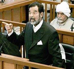 وأعلن صدام في بداية الجلسة عن انه مع معاونيه السبعة »مضربون عن الطعام منذ ثلاثة أيام«. وهتف صدام حسين عند دخوله قاعة المحكمة »الله اكبر عاش شعبنا العظيم وامتنا المجيدة وعاش المجاهدون«.