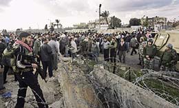 وكان شهود ذكروا ان فلسطينيين مسلحين فجروا خمس قنابل على الأقل على الحدود بين قطاع غزة ومصر ما احدث ثغرات كبيرة فيه .وتم تدمير قرابة ثلث الجدار الحدودي أي 5 كيلومترات من 14 بواسطة المتفجرات والبلدوزرات فجر أمس.