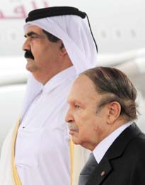 وصل أمير قطر الشيخ حمد بن خليفة آل ثاني أمس إلى العاصمة الجزائرية في زيارة عمل تلبية لدعوة الرئيس الجزائري عبد العزيز بوتفليقة. وكان في استقبال أمير قطر الذي يرافقه وفد كبير، في مطار الجزائر الرئيس بوتفليقة. ولم يفصح عن مدة هذه الزيارة. وأعلنت الرئاسة الجزائرية في بيان السبت أن «هذه الزيارة ستكون فرصة لبحث سبل تعزيز علاقات التعاون القائمة بين البلدين». وأضاف البيان أن البلدين يريدان أيضا «تعميق التنسيق والتشاور التقليديين حول مختلف القضايا العربية والإقليمية والدولية». وتقيم الجزائر وقطر علاقات سياسية واقتصادية جيدة. (ا.ف.ب)