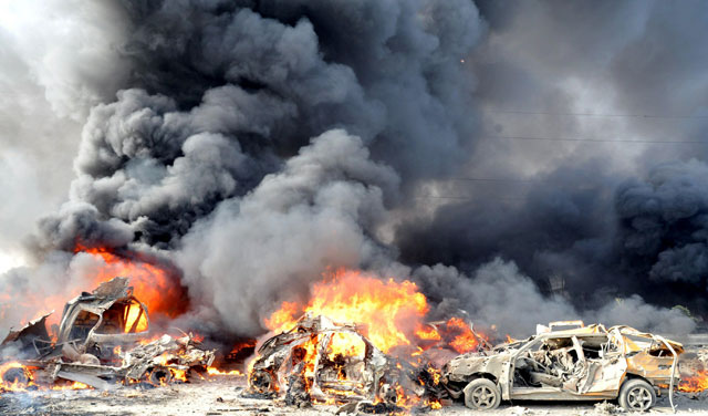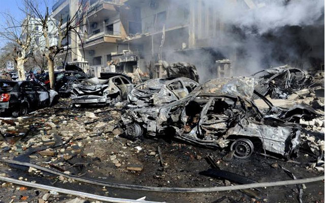 وكتب التلفزيون في شريطه العاجل "عشرات الشهداء والجرحى معظمهم من المدنيين في تفجيري دمشق الارهابيين".