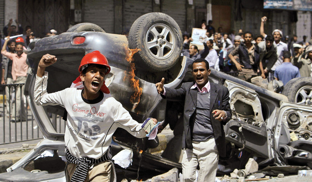 وفي صنعاء، حيث يواصل الآلاف الاعتصام في باحة جامعة صنعاء، اشتبك المعتصمون المطالبون برحيل الرئيس مع أنصاره الذين ارداوا الدخول الى ساحة الاعتصام وتطورت الاشتباكات بالحجارة والعصي إلى قيام المعتصمين بتحطيم سيارتين لأنصار الحزب الحاكم كانتا تحملان مكبرات صوت قبل ان يحرقوا إحدى هذه السيارات، ما ادى الى اصابة خمسة اشخاص.