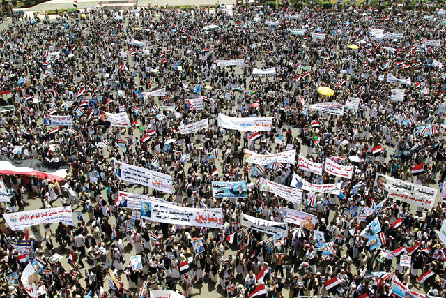 تظاهر عشرات الآلاف من المعارضين في العاصمة اليمنية صنعاء وعدد من المحافظات اليمنية أمس مطالبين بنظام «جديد» بعيداً عن الرئيس علي عبدالله صالح الذي يتلقى العلاج في المملكة العربية السعودية، فيما تقاطر عشرات الآلاف أيضاً من أنصار الرئيس اليمني تعبيرا عن الوفاء والدعم له.. وسط تسريبات عن مفاوضات سرية بين المعارضة والحزب الحاكم تجري برعاية أميركية أوروبية لإتمام عملية انتقال السلطة إلى الفريق عبدربه منصور هادي، الذي انتهت أمس المهلة التي منحتها إياه الثورة الشبابية لقبول نقل السلطة وتشكيل مجلس انتقالي، وقبل العودة المتوقعة للرئيس علي عبدالله صالح من السعودية حيث يتلقى العلاج.