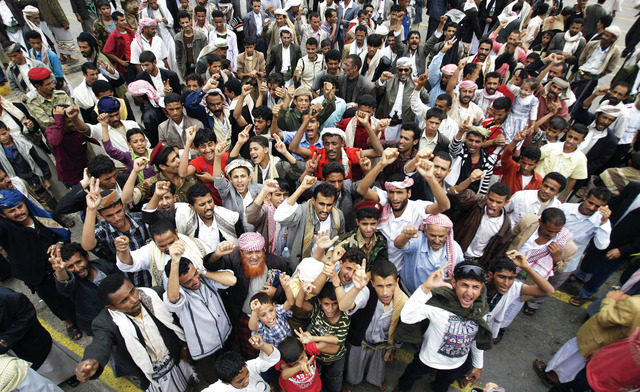 وتظاهر مئات الآلاف من اليمنيين أمس، في مدن تعز وإب وذمّار تنفيذاً لدعوة أطلقها المجلس الوطني لتنفيذ برنامج «الحسم الثوري» المطالب بإسقاط نظام الرئيس علي عبدالله صالح وأسرته الحاكمة منذ 1978، مرددين هتافات تطالب بالـ«الحسم الثوري» لإسقاط نظام صالح، ووصلوا الى المقار الحكومية بالمحافظات رغم الانتشار الأمني الكثيف للقوات الموالية لنجل الرئيس اليمني أحمد علي صالح.