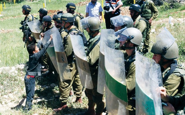 ،، مقاومة (أ.ف.بصبي فلسطيني يتصدى لجنود الاحتلال المدججين بالسلاح، والذين يتمركزون لقمع مسيرة فلسطينية مناهضة للاستيطان والاحتلال في بلدة بيت امر قرب الخليل أمس. )