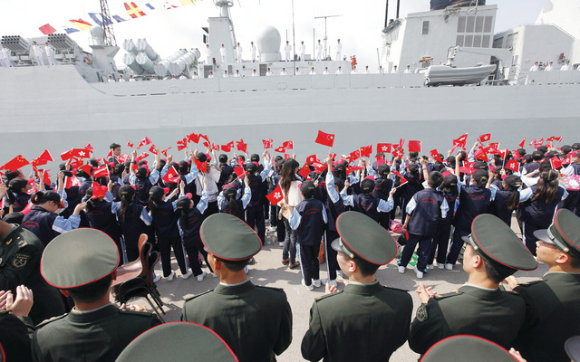 ذكرى (أي. بي.أيه)طلاب مدارس يستقبلون المدمرة الصينية هايكو التي وصلت إلى هونغ كونغ للمشاركة في الذكرى الـ 15 لعودة الجزيرة إلى الصين. وهو استعراض نادر للقوة العسكرية الصينية في هونغ كونغ منذ عودتها في 1997.