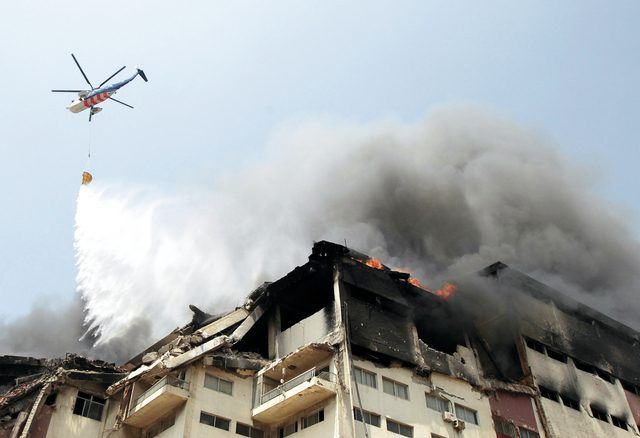 حادث (أ.ف.ب)مروحية من الدفاع المدني اللبناني تحاول إخماد حريق شب بمصنع للسجاد على الطريق السريع من الصفراء (شمال العاصمة بيروت) فيما لم يعرف بعد أسباب الحريق.