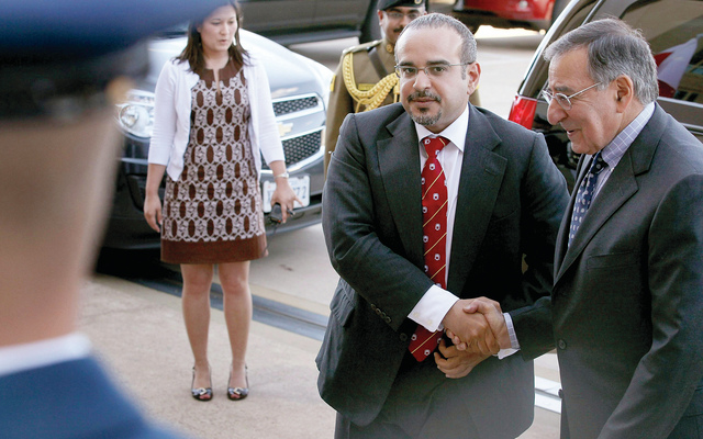 ولدى لقائه وزير الدفاع الأميركي ليون بانيتا، قال ولي العهد البحريني، إن «التحالف والتعاون العسكري بين البحرين والولايات المتحدة كانت له نتائج ترجمت على نطاق واسع وكان لها أثر كبير على المستوى الإقليمي»، مؤكداً أن «الدور الذي أداه هذا التحالف والتنسيق ساهم بشكل ملموس في صون أمن واستقرار المنطقة التي تمتلك أهمية استراتيجية على نطاق واسع». ونوه الأمير سلمان إلى «موقع البحرين الذي أثبت فاعليته وديناميكيته في الحفاظ على مصالح البلدين والمنطقة ككل بما تواجهه من تحديات».