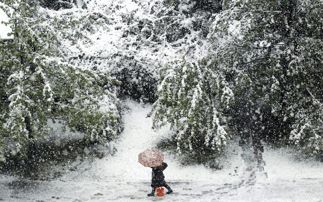 امرأة تسير وسط تساقط كثيف للثلوج في العاصمة البوسنية سراييفو أمس