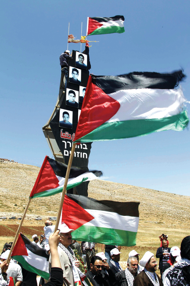 ذكرى (رويترز)فلسطينيون ولبنانيون يرفعون الأعلام الفلسطينية ومجسماً لخريطة فلسطين في ذكرى النكبة قرب قرية مارون الراس اللبنانية على الحدود مع إسرائيل