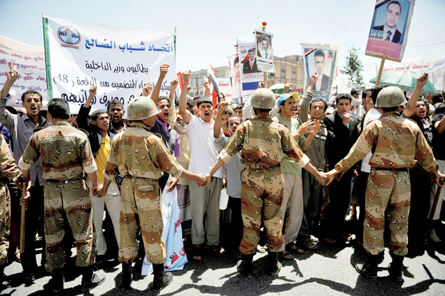 رحيل (إي بي إيهجنود يمنيون يصدون جموعاً غاضبة قرب منزل الرئيس عبد ربّه منصور هادي، تهتف ضد الرئيس السابق علي صالح، وتطالب بعزل أنصاره من المواقع العسكرية التي يشغلونها