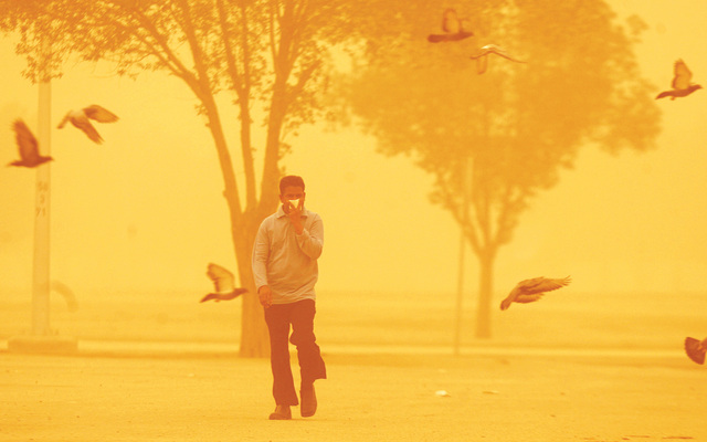 طيور تحلق حول رجل يسير في العاصمة الكويتية أثناء عاصفة رملية أمس