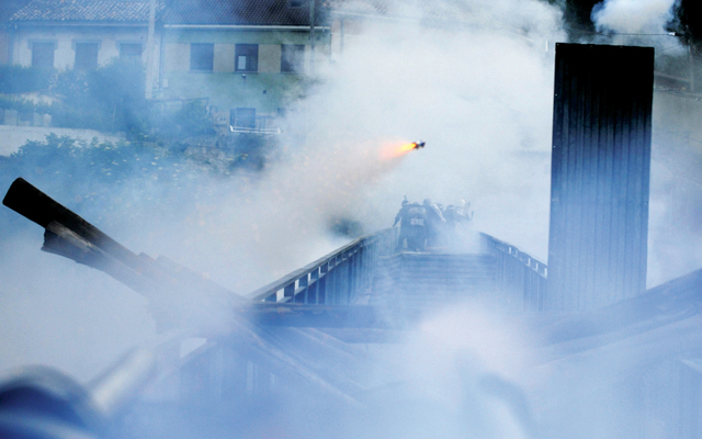 اشتباكات (رويترز)عمال مناجم الفحم يطلقون صاروخاً يدوياً، خلال اشتباك مع شرطة مكافحة الشغب الإسبانية قرب أوفييدو شمال البلاد، حيث كان العمال يحتجون على اقتراح الحكومة خفض تمويل الإنتاج.
