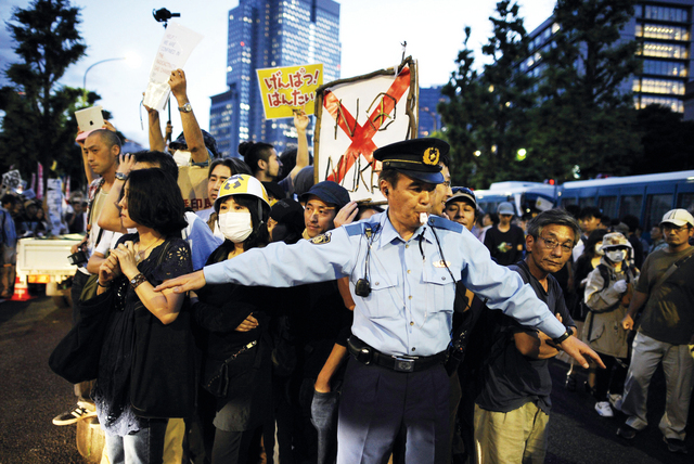 احتجاج (إي.بي.إيه)شرطي ياباني يؤمن حركة المرور في طوكيو أمس أمام متظاهرين محتجين على تشغيل مفاعل نووي