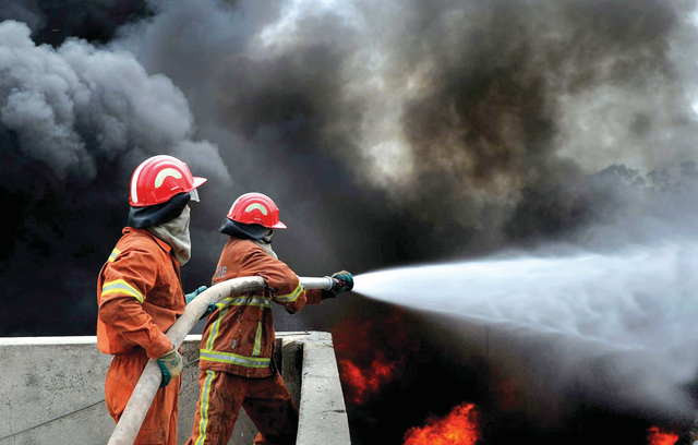 حريق (أ.ف.ب)رجال إطفاء يحاولون السيطرة على حريق اندلع في مستودعات لمفوضية الأمم المتحدة للاجئين في بيشاور شمالي باكستان، أمس.