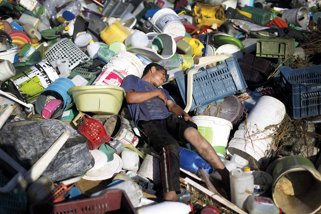 شقاء إي.بي.إيهصبي فلسطيني يأخذ قسطاً من الراحة فوق كومة من النفايات البلاستيكية والمعدنية التي يعمل على إعادة بيعها لتوفير قوت يومه.