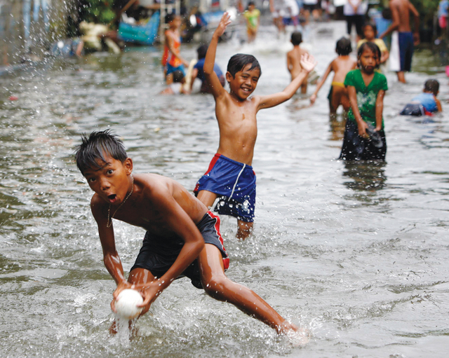 عاصفة رويترزأطفال يلعبون في بركة عميقة كونتها مياه الفيضانات الناجمة عن العاصفة الاستوائية التي اجتاحت شمال ووسط الفلبين وأدت إلى مقتل ثلاثة أشخاص.