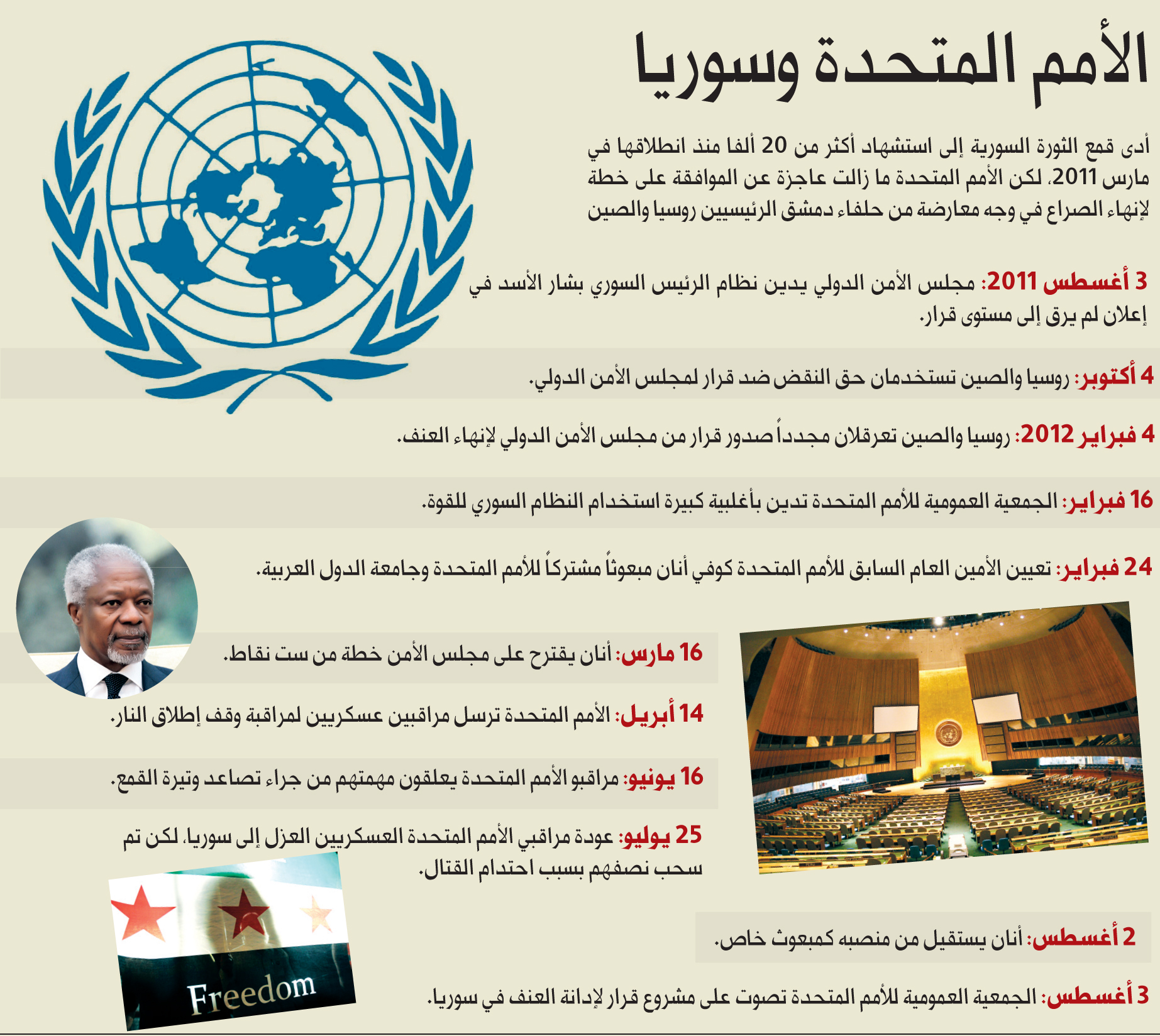 وأضافت أنه «قبل 5 أشهر، قبل بالمهمة الصعبة لإنهاء قتل المدنيين ورسم طريق باتجاه انتقال سياسي سلمي وقيام سوريا شاملة وممثلة للجميع بعد نظام الرئيس السوري بشار الأسد». وأكدت كلينتون أن أنان «عمل من دون كلل للتوصل إلى اتفاق في المجتمع الدولي، ووقف إراقة الدماء وقيام حكومة تلبي التطلعات المشروعة للشعب السوري».