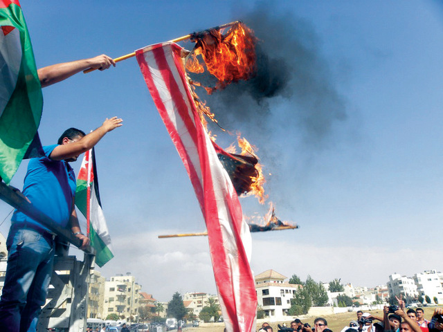 وتظاهر عشرات الأردنيين بالقرب من السفارة الإسرائيلية، مطالبين بإغلاقها وبإلغاء اتفاقية وادي عربة التي وقعت بين البلدين في عام 1994. وأحرق المتظاهرون العلمين الأميركي والإسرائيلي، وطالبوا بإغلاق السفارة الإسرائيلية، وإلغاء اتفاقية وادي عربة، وطرد السفير الإسرائيلي (دانييل نيفو)، وهتفوا: «فليسقط غصن الزيتون ولتحيا البندقية».