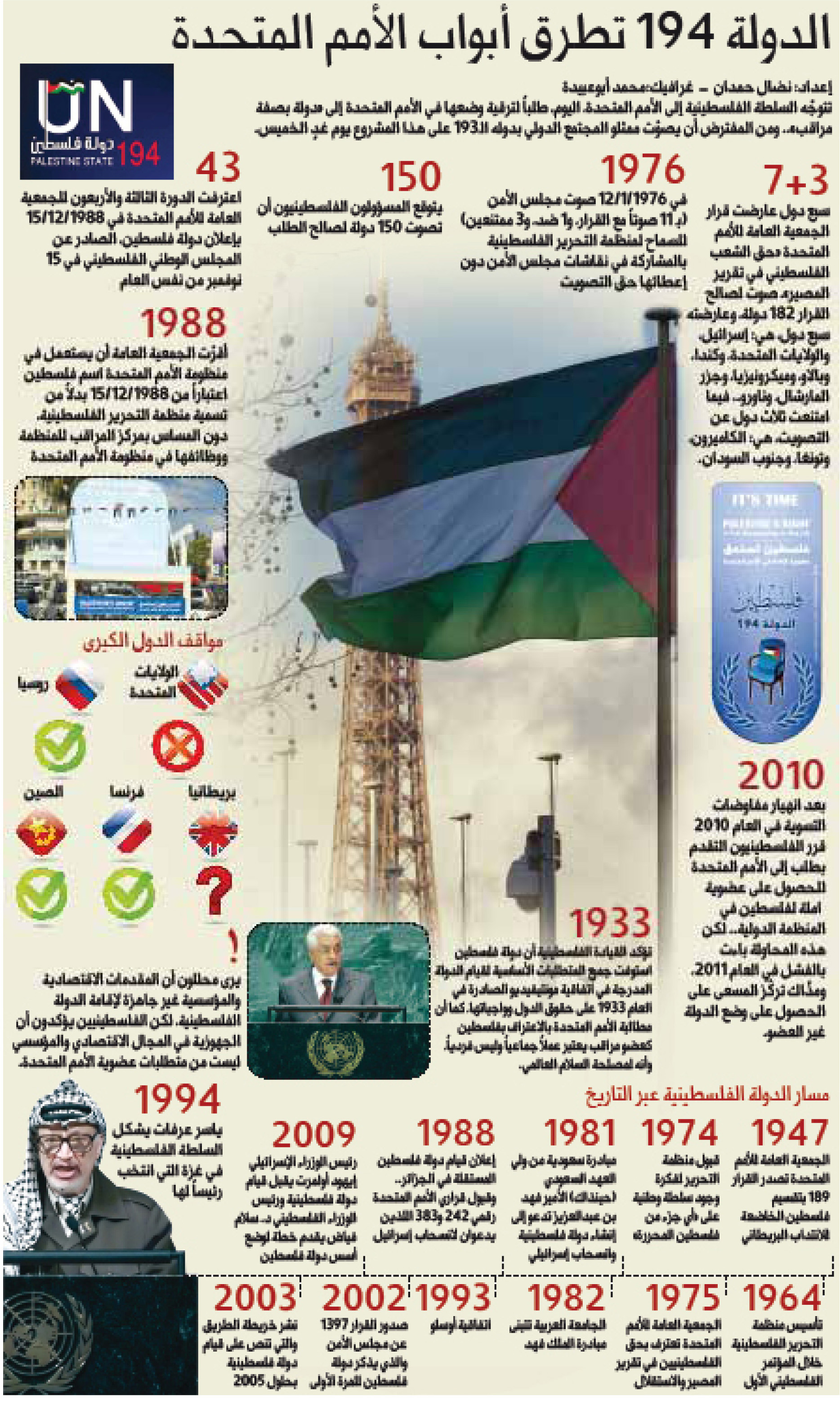 في الاثناء، وزعت البعثة الدبلوماسية الفلسطينية لدى الأمم المتحدة المشروع النهائي للطلب. وقال السفير الفلسطيني لدى الأمم المتحدة رياض منصور، للإذاعة الفلسطينية الرسمية، إن لدى البعثة ثقة بالحصول على أغلبية مريحة عند طرح مشروع الطلب للتصويت.