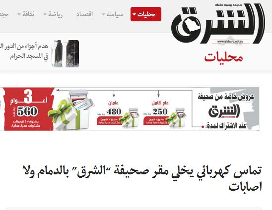 ادى تماس كهربائي إلى اندلاع حريق في مبنى صحيفة " الشرق " السعودية في الدمام ، حسبما ذكر الموقع الإلكتروني للصحيفة .