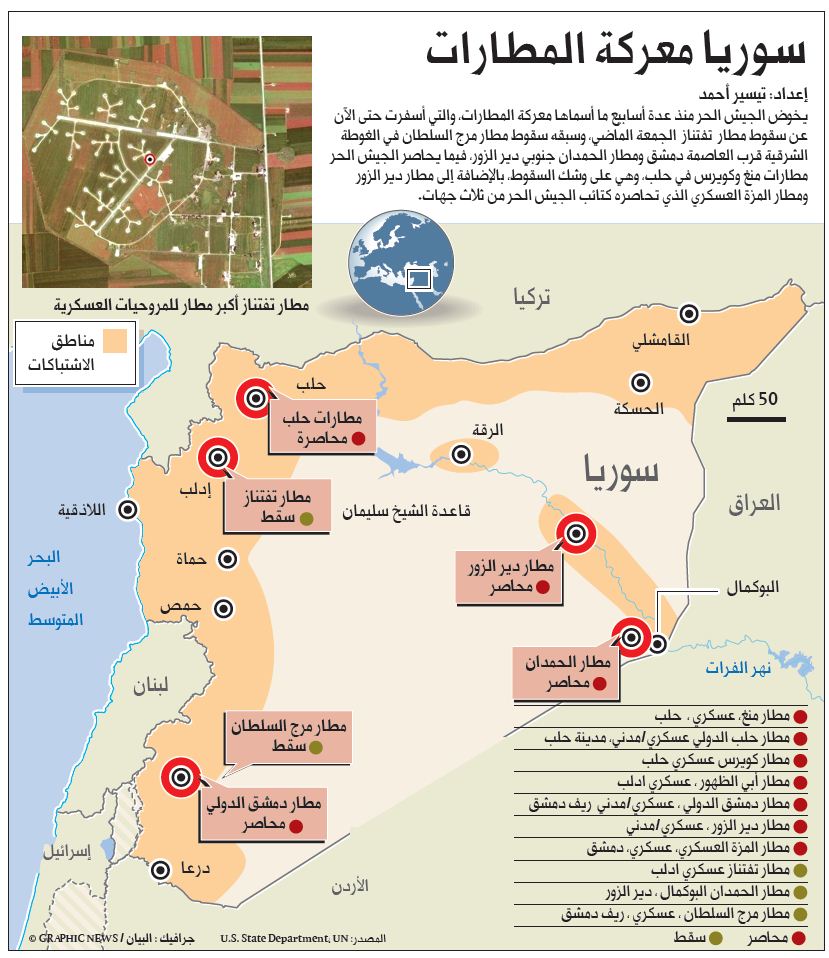 واشتد القتال أمس بين الثوار وقوات النظام السوري في محيط أكثر من مطار عسكري بريف حلب، بعد سقوط مطار تفتناز بريف إدلب في قبضة قوات المعارضة السورية، واشار الناشطون إلى انهيار معنويات ودفاعات القوات النظامية المحاصرة في مطارات منّغ وكويرس والنيرب في حلب وريفها، وقرب استسلام حامياتها بعد انقطاع الإمدادات عنها.